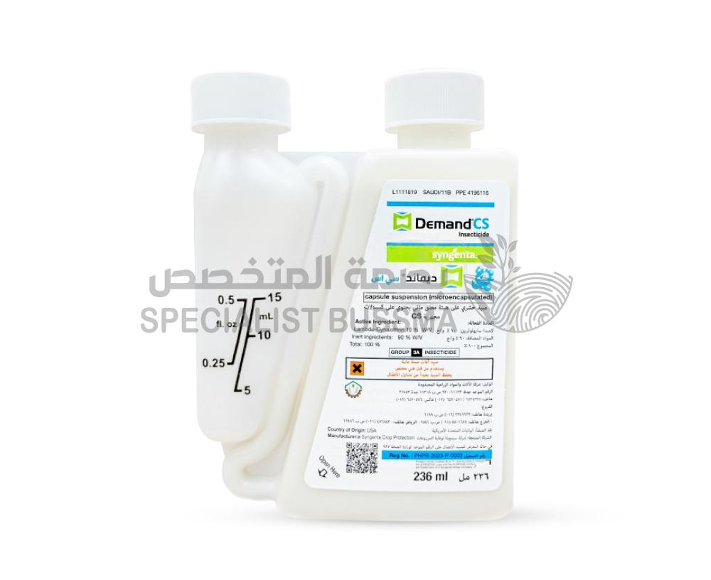 - ديماند سي اس مبيد حشري على هيئة معلق مائي يحتوي على كبسولات ميكرونية CS يحتوي على المادة الفعالة لامبدا سيهالوثرين من مجموعة البيريثرويدات المصنعة.
